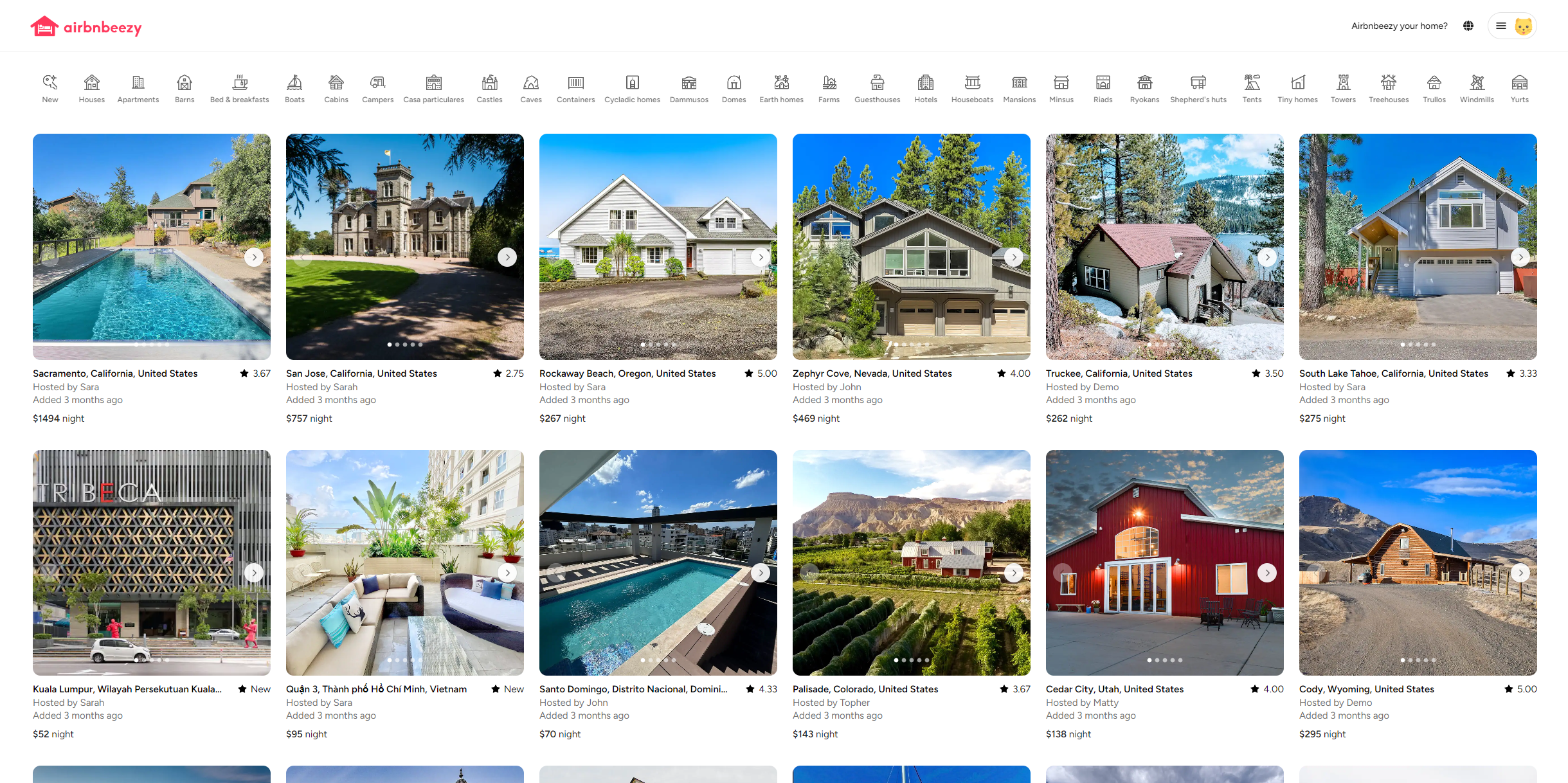 Properties are displayed with detailed information, images, pricing, and availability calendars. Users have the ability to post their own listings with full customization, including images.
